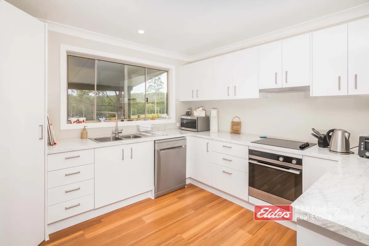 Floating timber floorboards, a cosy wood burning fire, reverse cycle air conditioning and ceiling fans provide comfort and style year-round. The open plan kitchen, dining and living space is light and inviting, with the fresh palette kitchen including a breakfast bar, electric cooking, dishwasher and an outlook over the property.